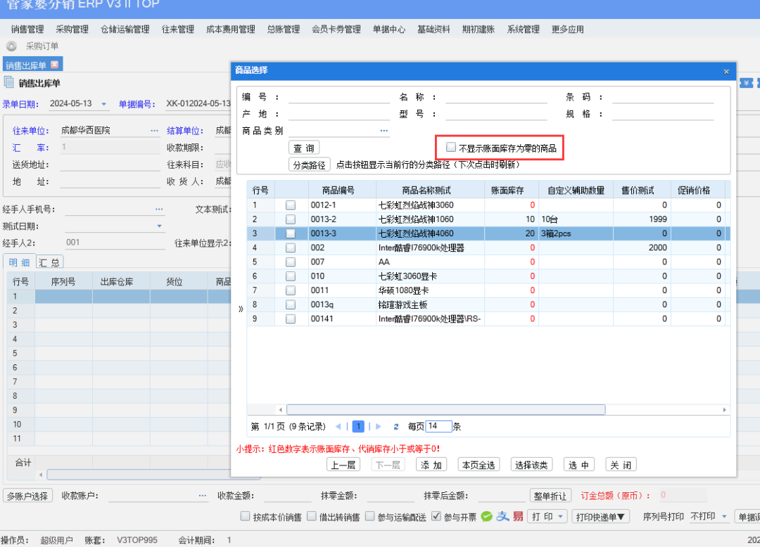 開單商品選擇框默認(rèn)是可以勾選【不顯示賬面庫存為零的商品】這個(gè)選項(xiàng)的,勾選了之后就不會(huì)顯示賬面庫存為零的商品,便于用戶快捷查詢商品。如果不顯示這個(gè)選項(xiàng)應(yīng)該如何排查呢?