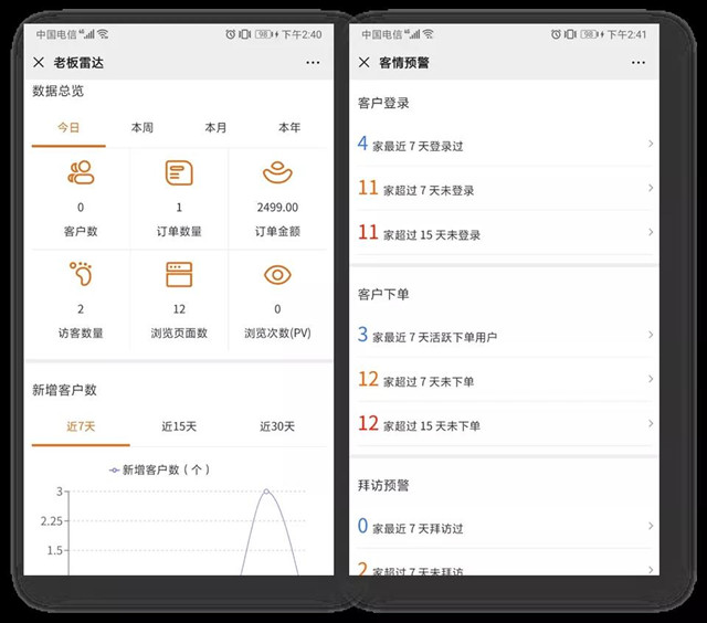 客戶信息沉淀更全面,拉新、留存、轉(zhuǎn)化、復購環(huán)環(huán)緊扣,客戶一旦注冊,通過老板雷達、客情預警便可有針對性地持續(xù)互動營銷,不斷激發(fā)客戶潛藏下單量。