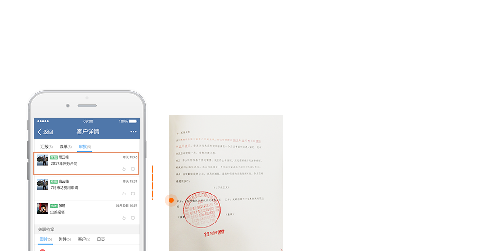 上級(jí):誰發(fā)起的,跟哪位客戶,需要審批什么,一清二楚,移動(dòng)審批,效率高