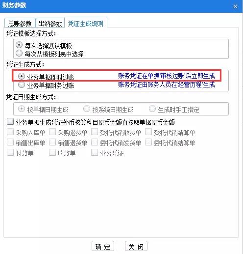 首先,憑證生成方式要選擇過賬后自動生成會計憑證:總賬管理—財務(wù)參數(shù)—憑證生成規(guī)則—憑證生成方式選擇業(yè)務(wù)單據(jù)即時過賬。