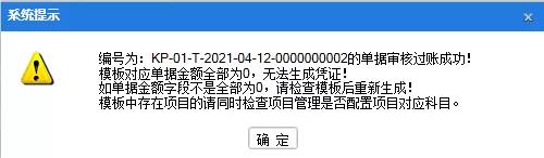 4、提示:模板對應(yīng)單據(jù)金額全部為0,無法生成憑證!如果單據(jù)金額字段不是全部為0,請檢查模板后重新生成!模板中存在項目的請同時檢查項目管理是否配置項目對應(yīng)科目。