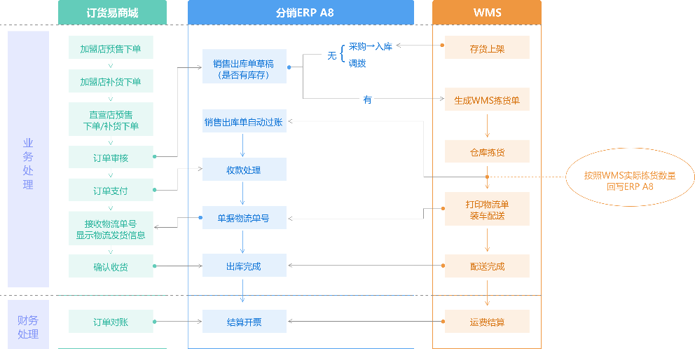 3、分銷ERP系統(tǒng)中的銷售出庫(kù)單處理后,數(shù)據(jù)信息同步到倉(cāng)儲(chǔ)WMS系統(tǒng),進(jìn)行揀貨、發(fā)貨等作業(yè)。