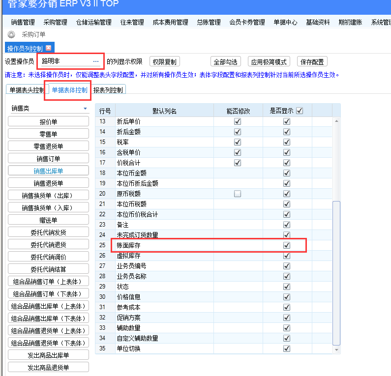 2、普通操作員登錄沒有該選項(xiàng),檢查單據(jù)表體是否有賬面庫存字段,如果沒有,右鍵增加一列操作確認(rèn)能否增加顯示該字段,右鍵增加一列沒有的話,admin登陸軟件-系統(tǒng)管理-單據(jù)設(shè)置-操作員單據(jù)報(bào)表列控制-選擇操作員,檢查對(duì)應(yīng)單據(jù)表體字段,檢查表體賬面庫存字段是否顯示有沒有勾選,該字段勾選以后單據(jù)表體增加顯示出來再操作選擇商品即可。